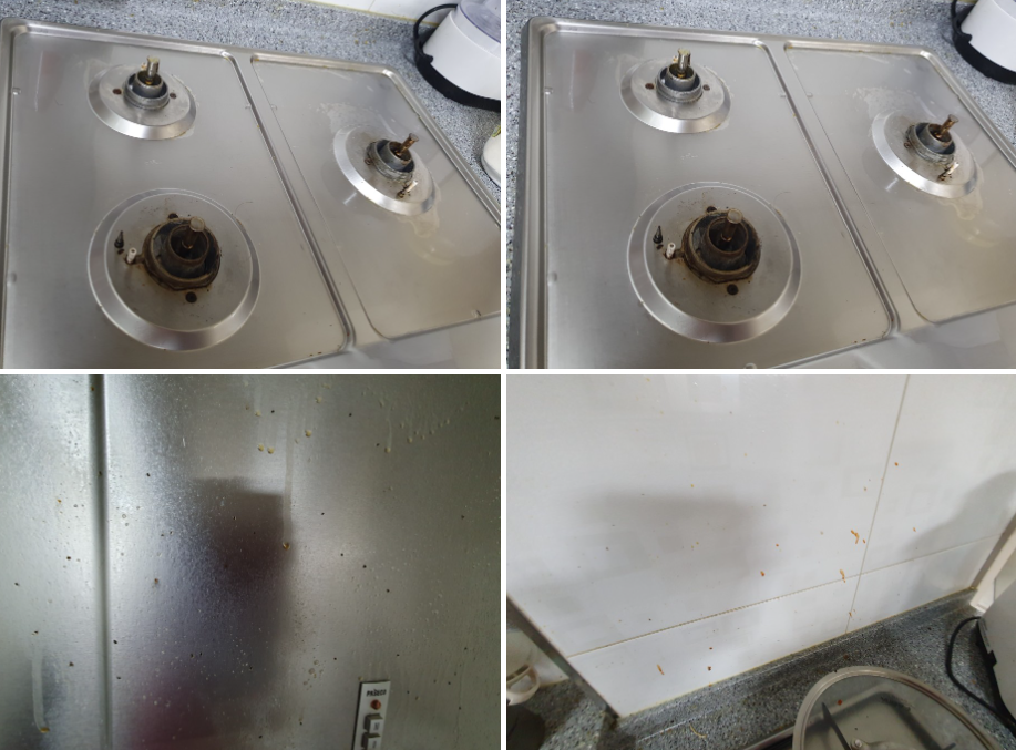 이번 현장 역시 마찬가지로 타일, 주방 후드, 가스레인지 상판 주변까지 기름때로 인해