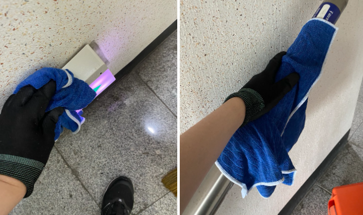 쌓인 먼지 계단의 난간도 먼지 제거를 동시에 하며 내려갑니다.