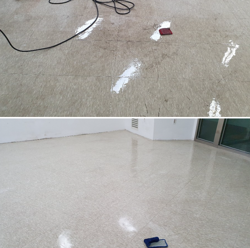 바닥에 얼룩이나 찌꺼기가 없이 깨끗해야 왁스가 경화된 후 이쁘게 작업이 완료되기 때문입니다.